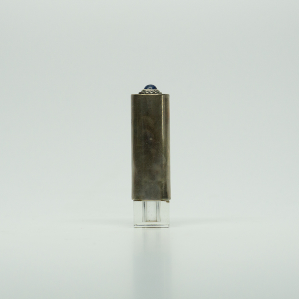 A silver tube with a clear acrylic prism base. The top of the tube is decorated with a simulated sapphire. A label on the bottom reads, "American Beauty / Hudnut."