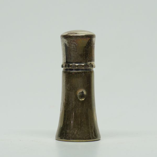 A sterling silver lipstick case with geometric engraved design and, "Helena Rubinstein," engraved under its lid. The bottom is also engraved, "Sterling Silver / Pat Pending."