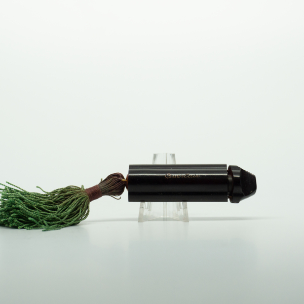 A plastic lipstick case with, "Guerlain," etched on the front. There is a green thread tassel at the end.