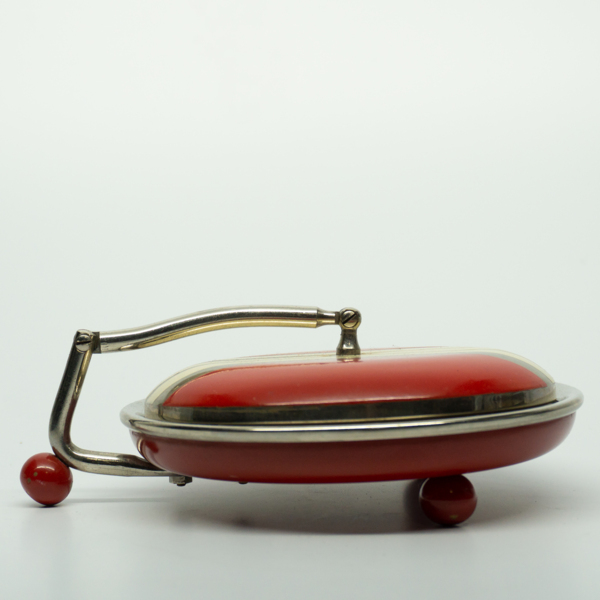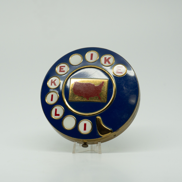 A red, white and blue round telephone dial compact with the slogan, "I Like Ike," stamped into the circular dial. At the center of the dial is a solid red shape resembling the territory of the United States of America. The compact opens on a hinge…