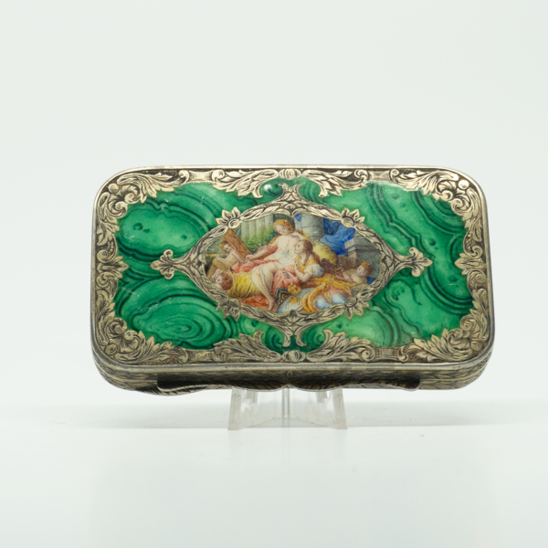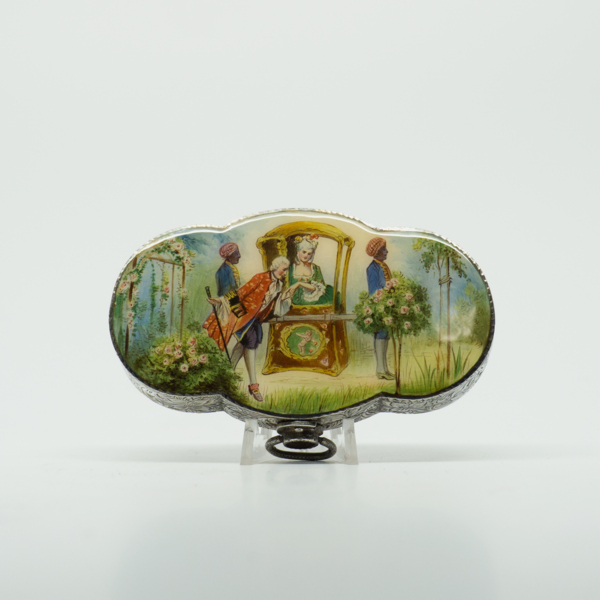 A compact made in Italy. The front lid is an enamel hand painted scene on a silver, round-edged compact. The back lid is engraved with an ornate floral design. The compact opens at a hinge with a finger ridge. Inside, there are two pressed powders…