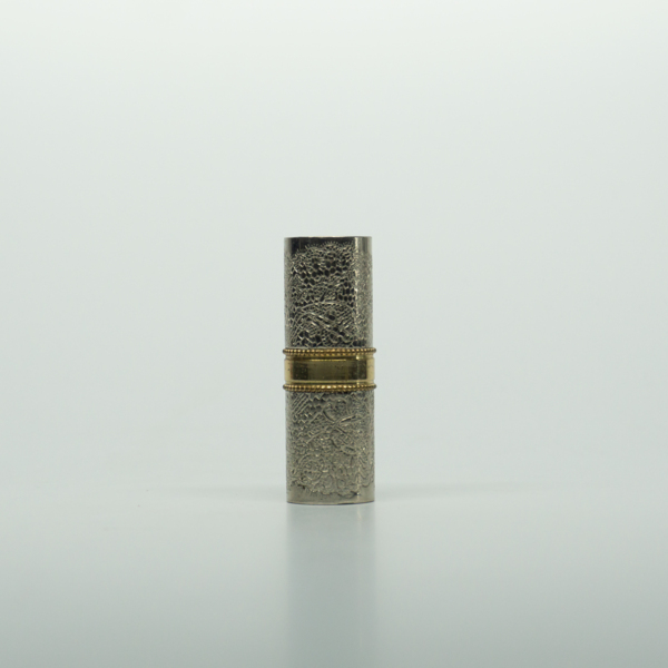 A sterling sliver lipstick holder wrapped in an organic, spherical pattern around the cylindrical tube. A brass ring with small spheres on top and bottom sits just below the opening. When open, the tube reads, "Marcel Rochas."