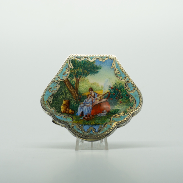 A compact made in Italy. The front lid is an enamel hand painted scene on a silver, round-edged compact. The back lid is engraved with an ornate floral design. The compact opens at a hinge with a finger ridge. Inside, there are two pressed powders…