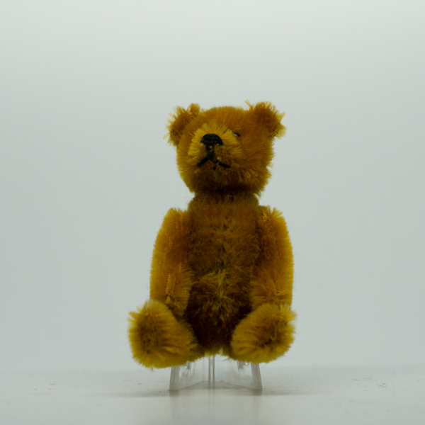 A yellow-brown mohair compact shaped like a bear with arms, legs, and a head. To open the lipstick, the head is removed. Accessing the powder, puff and mirror is then possible by opening the belly of the compact.