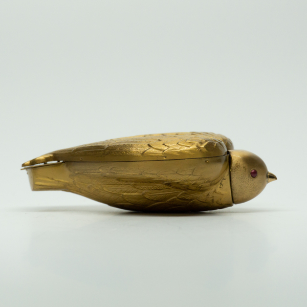 The Bird-in-hand compact has three compartments: a powder well with mirror and puff, a pill box and a lipstick. The bird's head holds the slide-out lipstick and the body contains the powder well, opening at the hinge. The satin bronze bird compact…