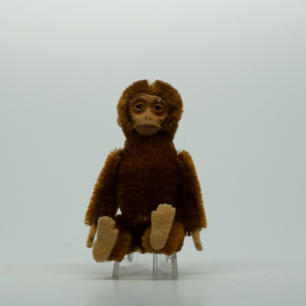 A dark-brown mohair compact shaped like a monkey with arms, legs, and a head. The flocked face is a soft brown. To open the lipstick, the head is removed. Accessing the powder, puff and mirror is then possible by opening the belly of the compact.