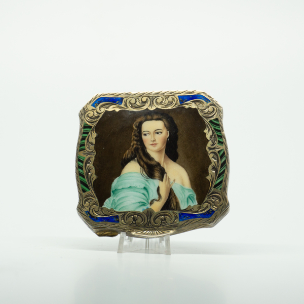 A compact made in Italy. The top lid is painted with a portrait within scalloped edges. The back lid is an engraved floral design. The compact opens at a hinge with a finger ridge. Inside there is a mirror and powder well.