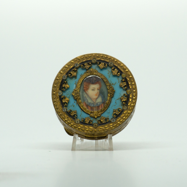 A compact made in Italy. The top lid is painted with a portrait surrounded by stones, set on a gold, cylindrical compact. The back lid is engraved with an ornate organic design. The compact opens at a hinge with a finger ridge. Inside, there is a…