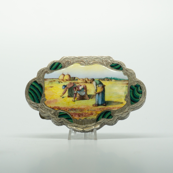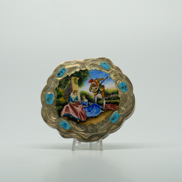 A compact made in Italy. The front lid is painted with a scene within silver scalloped edges. The back lid is engraved in a floral design. The compact opens at a hinge with a finger ridge. Inside, there is a mirror the same size as the top lid…