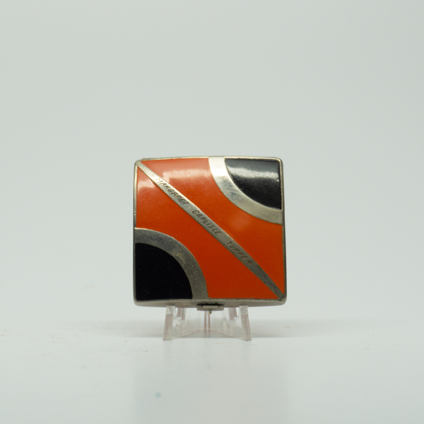 A silver plated compact with geometric black and orange enamel top. The compact is engraved, "Margaret Carlisle Tupper." It opens on a hinge with a clasp.