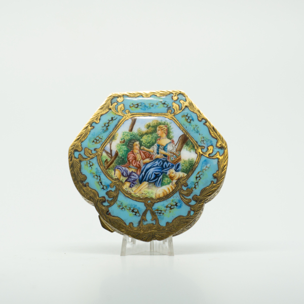 A compact made in Italy. The top lid is painted with a scene within gold scalloped edges. The back lid is engraved in an organic design. The compact opens at a hinge with a finger ridge. Inside, there is a powder well, sifter and a light blue puff…