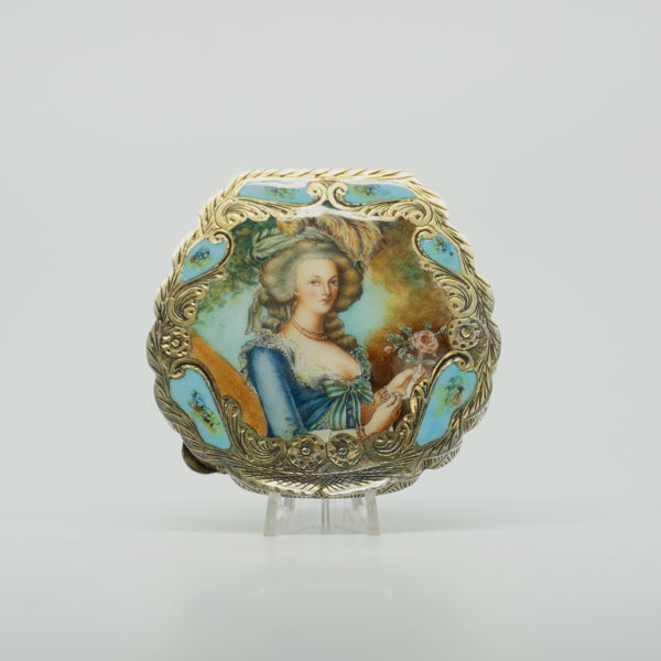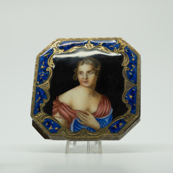 A compact made in Italy. The top lid is painted with a portrait within scalloped edges. The back lid is an engraved floral design. The compact opens at a hinge with a finger ridge. Inside there is a mirror and powder well.