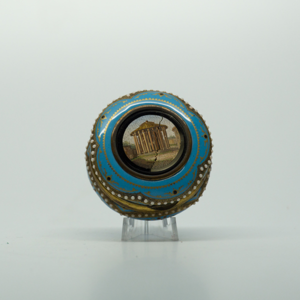 A jar made in Italy. The top is painted with a scene decorated in gemstones set into the edges. The back lid is painted in an organic symmetrical design. The jar opens at a hinge with a finger ridge. Inside, there is a powder well, sifter, pink puff,…