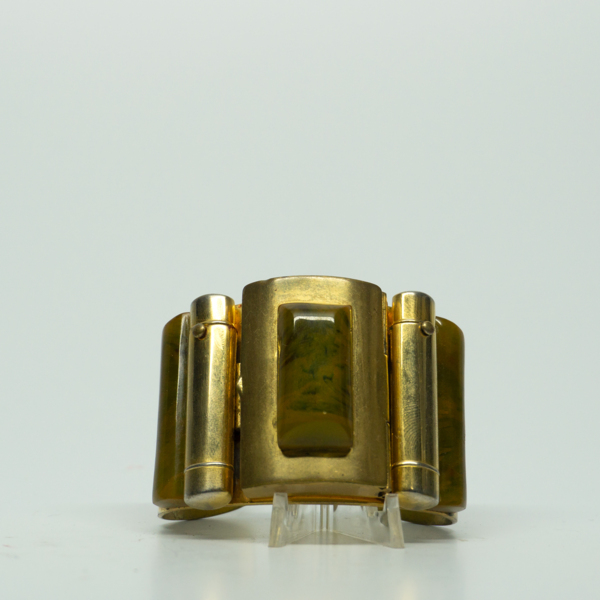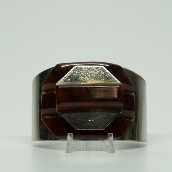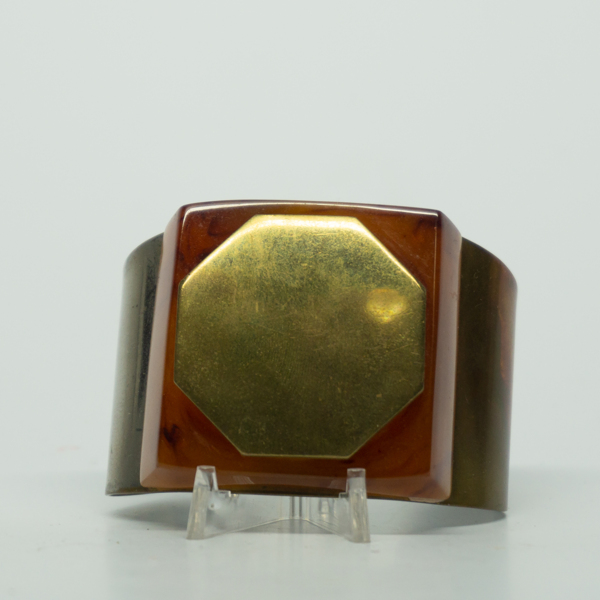 A bakelite and tin compact bracelet. The top of the bracelet has deep brown art deco design with silver accent. The top opens to reveal a mirror, powder well and puff.