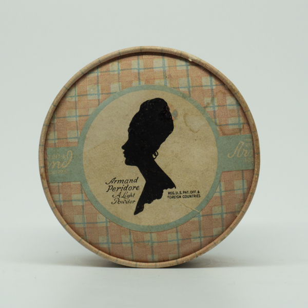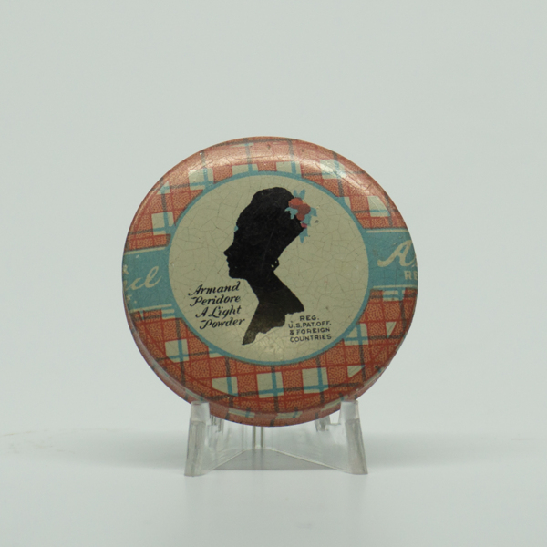 A black, white, red and blue tin featuring a feminine silhouette on the center of the top. Text surrounding the silhouette reads, "Armand Peridore / A Light Powder / Reg U.S. Pat. Off. & Foreign Countries." A shade label on the bottom of the tin…
