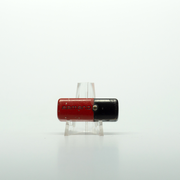 A small, flat cylindrical aluminum liptick tube with a red enamel lid. The lid has black ennamel text reading, "Armand." The lipstick can be accessed by sliding up an outer button.