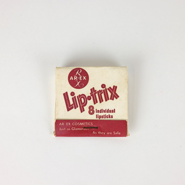 A rectangular cardboard container printed with red text reading, "AR-EX / Lip-trix / 8 individual lipsticks / AR - EX Cosmetics / Just as Glamorous as they are safe." The container can be opened by lifting the top from underneath a tab at the bottom…