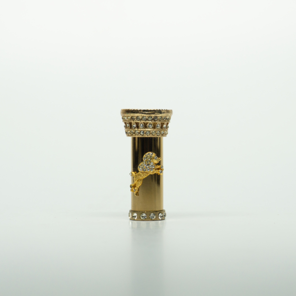A brass tube with colorless rhinestones simulating diamonds placed around the base and top. The center of the lid is decorated with a poodle figure also embellished with simulated diamonds. The top of the tube has a flat circular mirror.