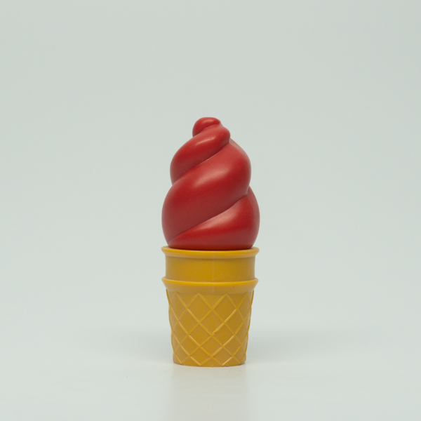 A red and tan plastic soft serve ice cream cone shaped lip pomade. The top of the lip pomade is a red soft serve. To access the lip pomade the soft serve slides off and the cone twists.
