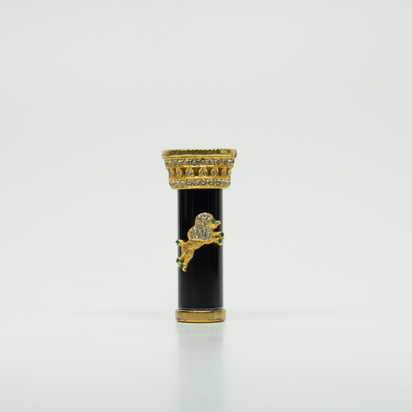 A black enamel tube with colorless rhinestones simulating diamonds placed around the brass base and brass top. The center of the lid is decorated with a brass poodle figure also embellished with simulated diamonds and emeralds. The top of the tube…