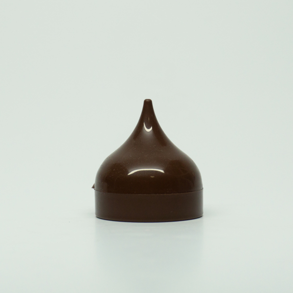A plastic dark brown Hershey Kiss shaped lip gloss. To access the lip pomade, remove the top and twist. A shade label reads, "Avon / Lip Gloss / Avon Prod. Inc., N.Y., N.Y. 10019."