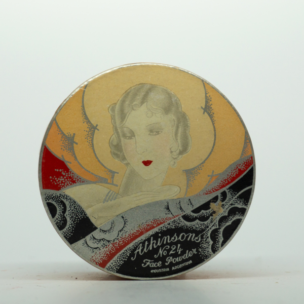A round container printed in red, orange, black and white featuring a graphic feminine figure among swirling fields of color on its lid. Text below the figure reads, "Atkinsons / No. 24 / Industria Argentina. A shade label on the bottom is printed in…