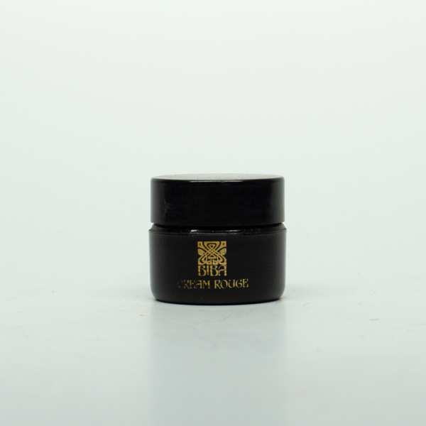 A round glass container with a black plastic top. The front of the container has a Biba logo and, "Cream Rouge," printed on it. The back of the container reads, "Cream Rouge Net. Wt. 3 16 oz. 5 Grms. / Not to be used around the eyes." A shade label…
