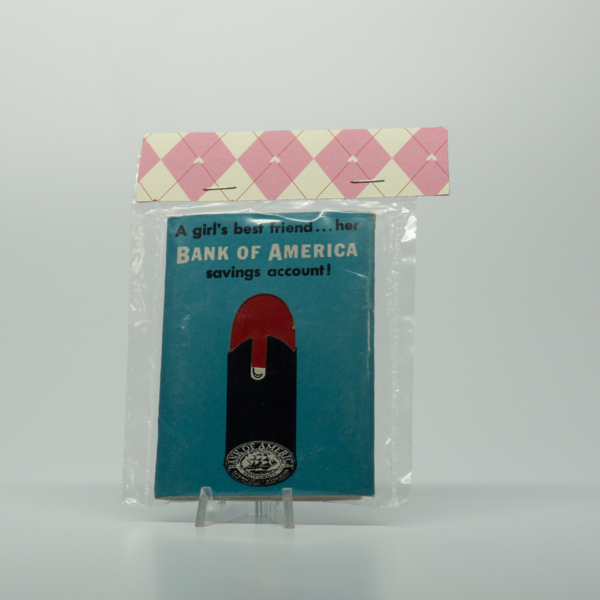 A plastic wrapping stapled to a pink argyle and cardboard strip holding a rectangular red, white and blue cardboard container. The front of the container is printed with a lipstick tube below black and white text reading, "A girl's best friend...her…
