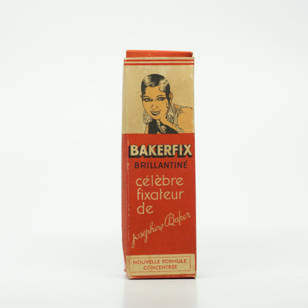 A red cardboard box with a stylized image of Josephine Baker on the front and a stylized gentleman with dark hair on the back. The cream block text on the front reads, "Bakerfix / Brilliante / celebre fixateur de Josephine Baker / nouvelle formule…