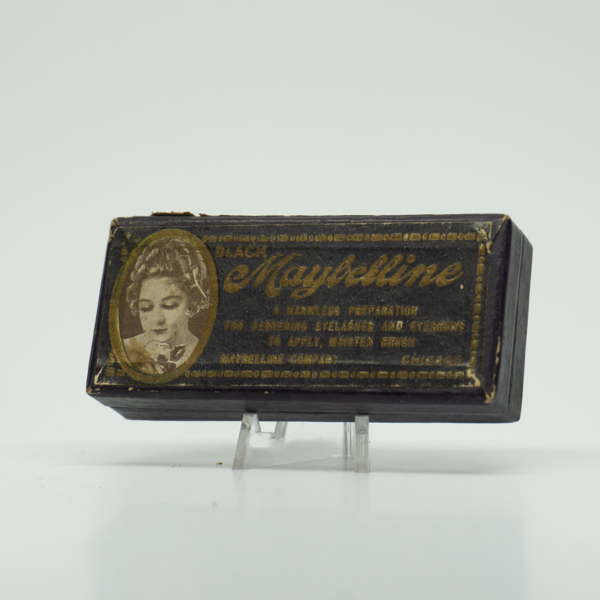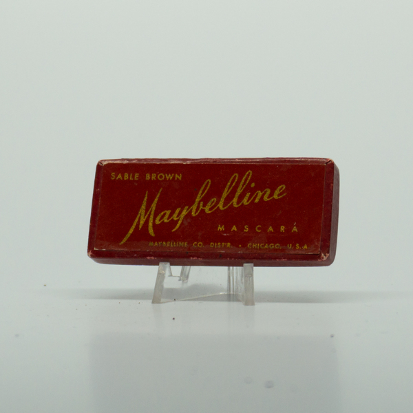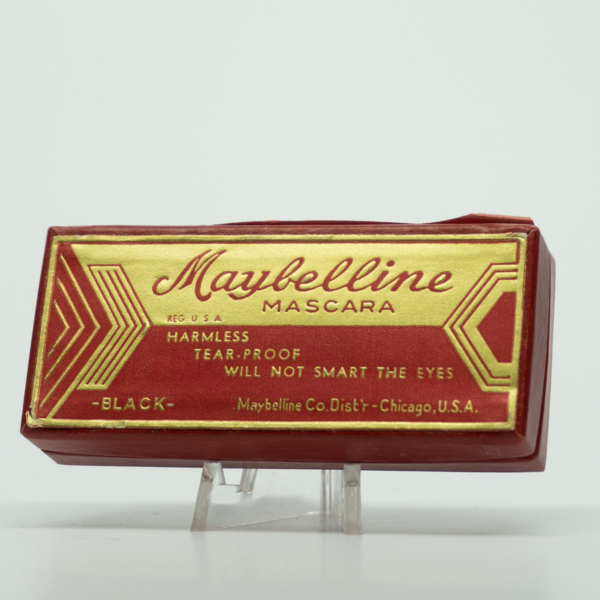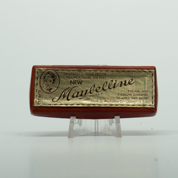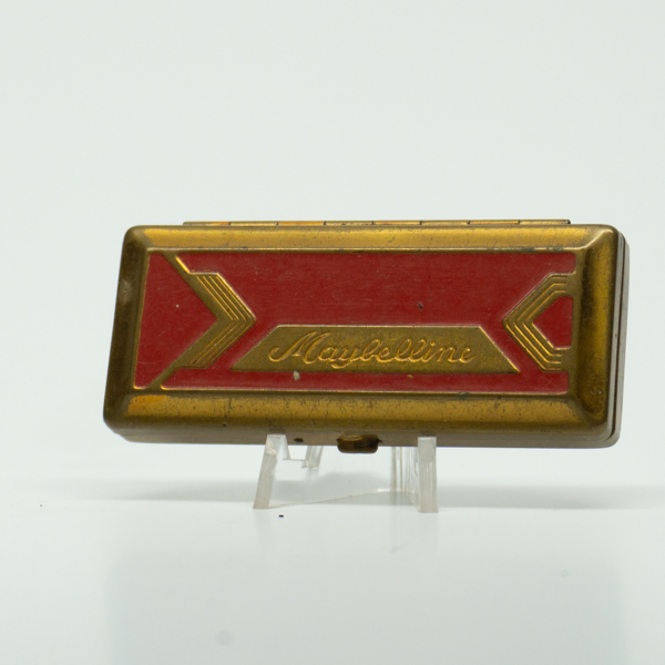 A rectangular brass container with red enamel graphics. Text on the top of the container reads, "Maybelline." The back of the container reads, "Black / Maybelline Co. Chicago U.S.A"