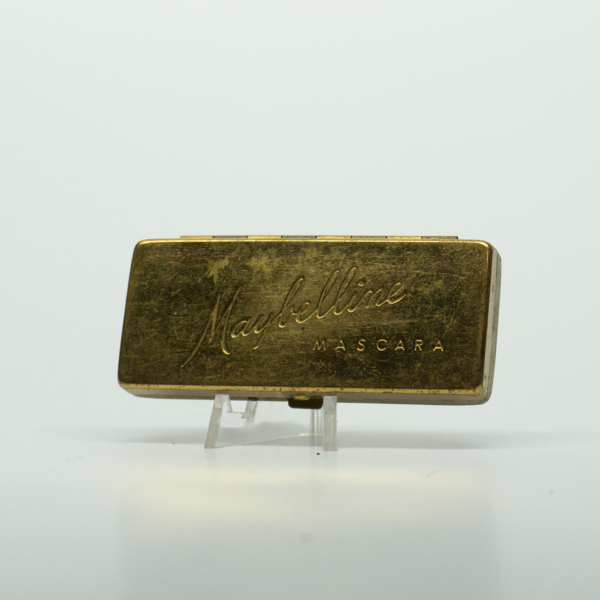 A rectangular brass cake mascara case engraved, "Maybelline Mascara." Inside is an application brush and instructional pamphlet. The bottom reads, "Brown / Maybelline Co. Distr. - Chicago, U.S.A."
