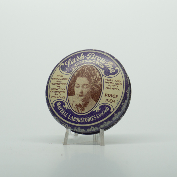 A round tin container with the "Maybell Girl," at its center surrounded by blue and white graphics reading, "Lash-Brow-Ine / Reg. U.S. Pat. Off. / For stimulating and promoting the growth of eyebrows and eyelashes / Pure and Harmless apply nightly. /…