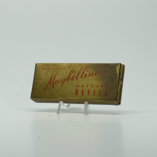 A gold cardboard box printed, "Sable Brown / Maybelline / Mascara Refill," on its front. The back reads, "Directions / The is a refill for the Maybelline metal case. Take pen knife or nail file and remove old tray. Then merely snap new refill into…