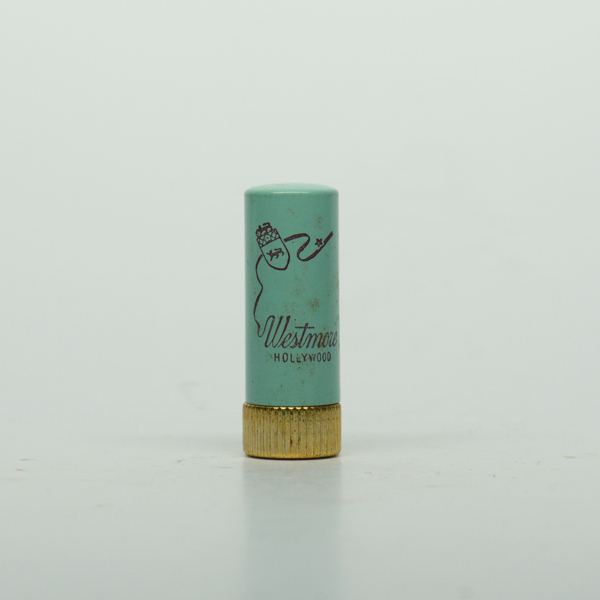 A teal enamel lipstick tube with a tin base. The top features a dark pink House of Westmore logo. The tube can be opened by removing the top from the base. A shade label on the bottom reads, "House of Westmore Inc. / Distributor Hollywood Calif. Made…