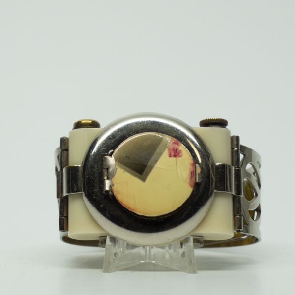 An art deco style bakelite compact with a black eyeliner, a black eyeshadow stick, a nail file, a comb all inside this bracelet. There is a powder well, a cheek rouge in the center and another lipstick on the side of the bracelet.