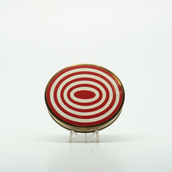 A compact with red and white stripes on its top. The top can be lifted on a hinge. Inside, there is a powder well, mirror and puff.
