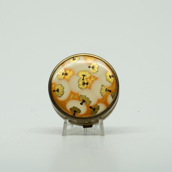 A round brass container with red, gold, orange and white graphic representation of puffs on its lid. The container opens on a hinge with a finger clasp. Inside is a powder, mirror and puff printed, "Coty." The bottom of the container is decorated…