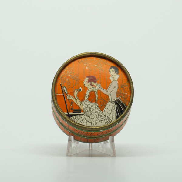 A circular container with a full color depiction of a high-society vanity scene on its top, gold rings along its edges and floral motif on its side. A shade label on the bottom reads, "Naturelle / Three Flowers Face Powder / Clings tenaciously to…