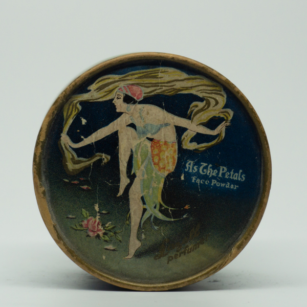A round container featuring a full color print of a dancer on its lid. Text beside the dancer reads, "As The Petals Face Powder / Lazell Perfumer." A product description on the bottom reads, "As The Petals Face Powder is made in White, Natural, Rose…