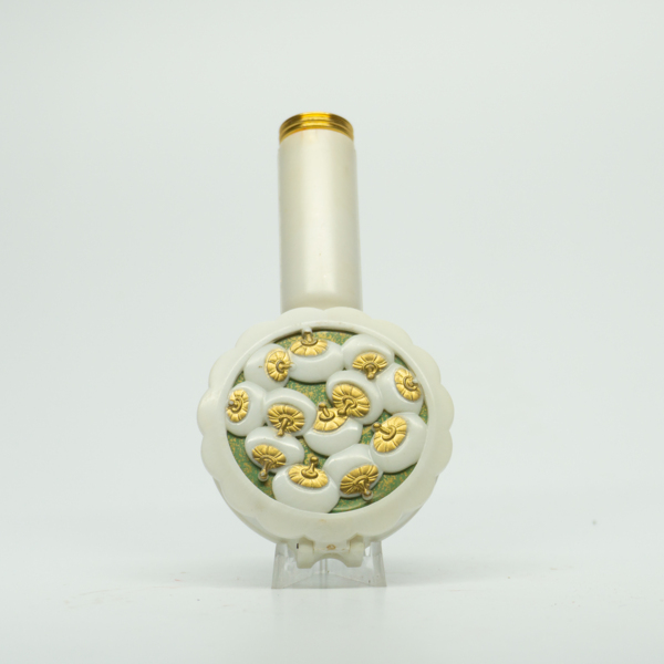 A white tortoise shell container shaped like a hand mirror. It holds a powder and a lipstick. The top of the container is decorated with graphic representations of powder puffs. Text on the back of the container reads, "Naturelle." And a shade label…