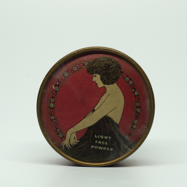 A round container printed in red, brown, white and black featuring a feminine figure wearing a gown in profile surrounded by a floral garland on its lid. Text reads, "Light Face Powder." A product description on the bottom reads, "[text obscured]…