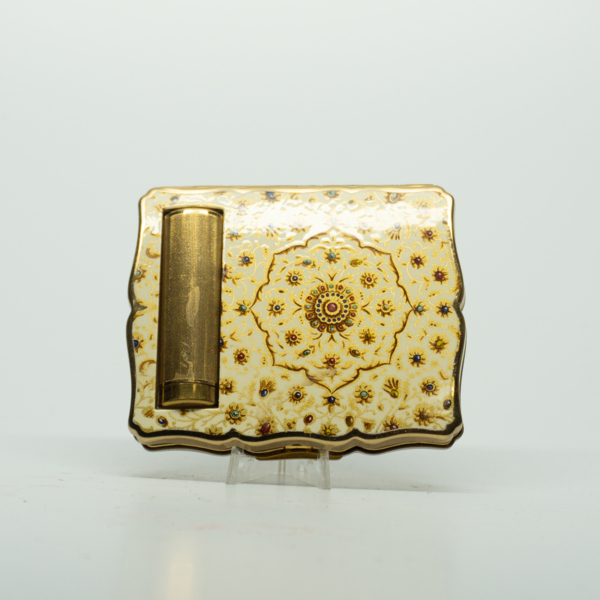 A combined powder and lipstick compact with scalloped edges. The lipstick can be accessed by lifting the tube at an angle away from the surface of the compact. The enamel top is embellished with an intricate jewel pattern. Inside the powder compact,…