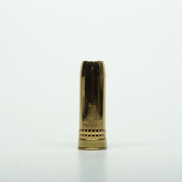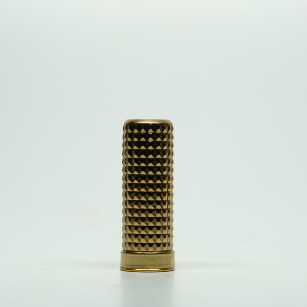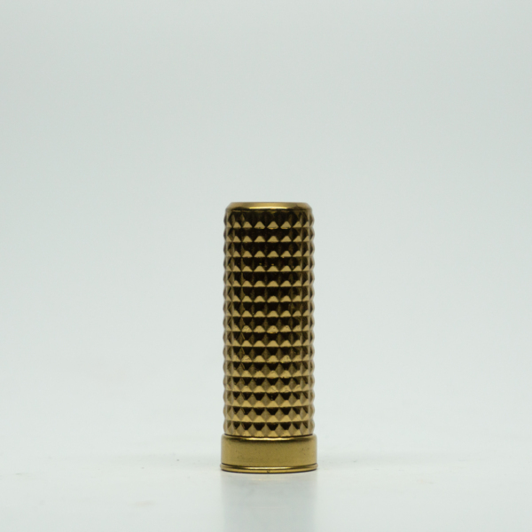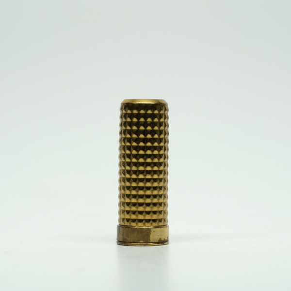 A brass lipstick tube with textured top. The lipstick can be accessed by removing the top and twisting the tube. A shade label on the bottom of the tube reads, "Coral Glow / 110 / Max Factor & Co. / Hollywood, Calif. U.S.A."