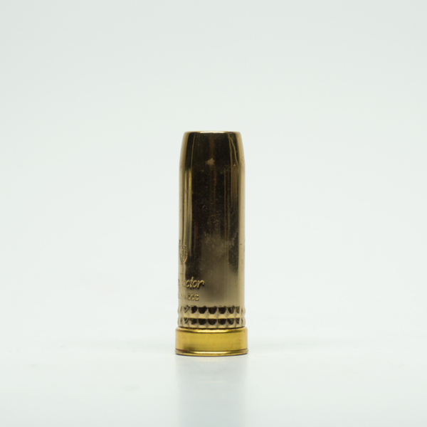A brass lipstick tube with textured ring near the bottom of the tube. The lipstick can be accessed by removing the top and twisting the tube. A shade label on the bottom of the tube reads, "See Red / Max Factor Hollywood U.S.A. / Color Fast"