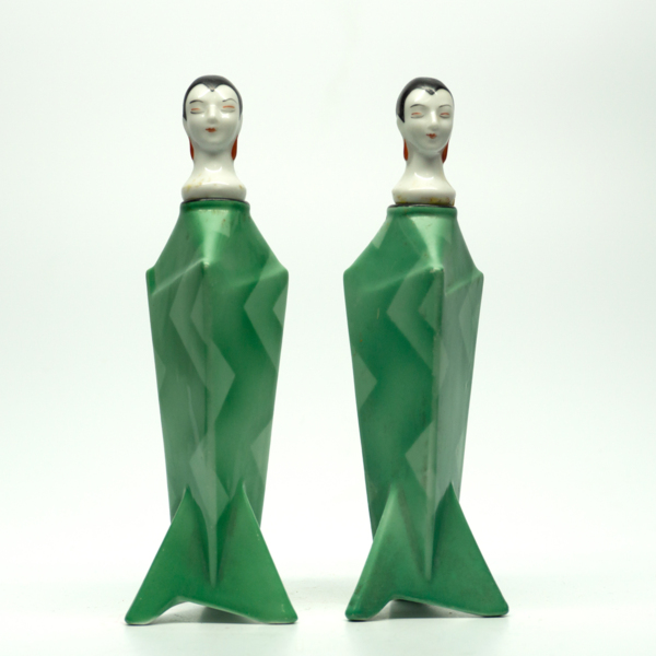 A feminine figure wearing makeup dressed in costume. The puff is disguised as the figure's skirt. The puff can be lifted from the bottom of the figure which then can be used as a powder well.