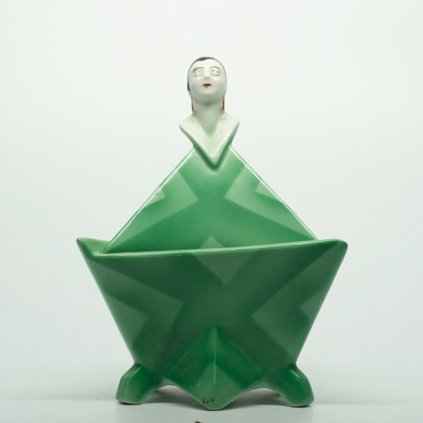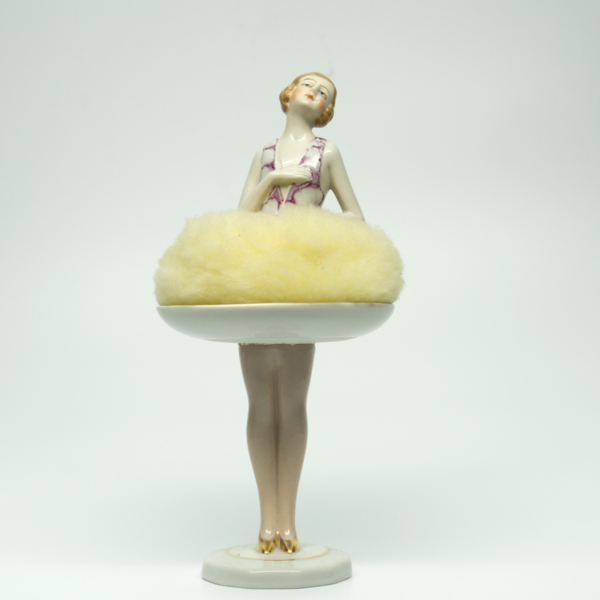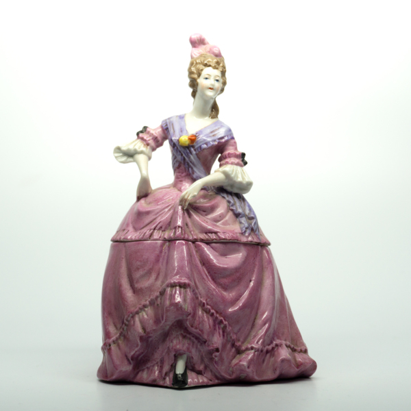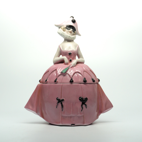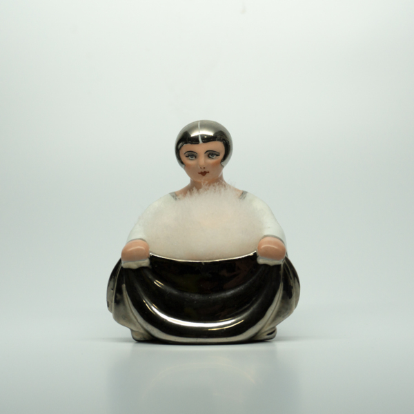 A seated feminine figure wearing makeup dressed in costume. A puff sits in the lap of the figure. Once the puff is lifted, the lap can be used as a powder well.