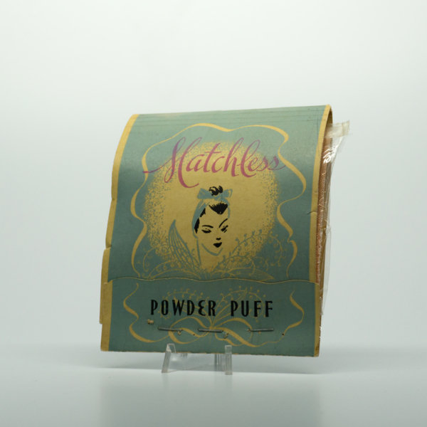 A yellow, blue and black rectangular cardboard container with a feminine figure at its center. Text surrounds the figure reading, "Matchless / Powder Puff." The container can be opened by lifting the top from underneath a tab at the bottom of the…