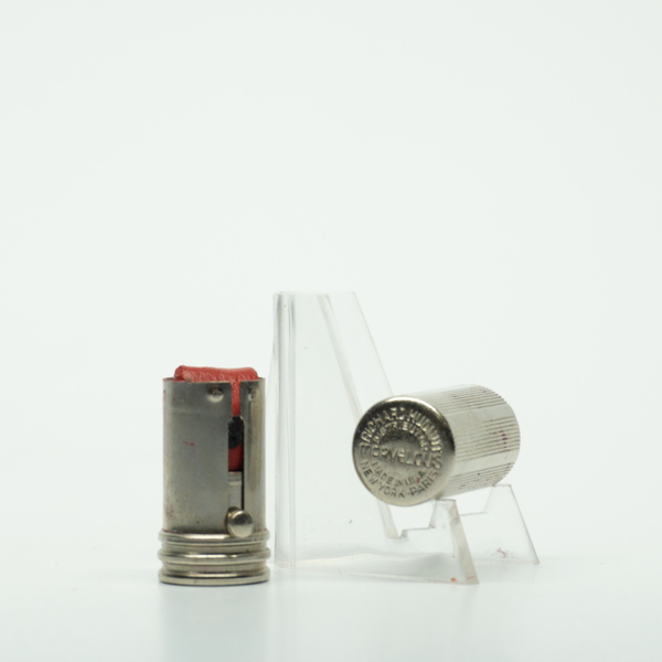 A small, silver plated lipstick tube. Once the lid is removed, the lipstick can be accessed by sliding up an outer button. The top of the lid is engraved with text reading, "Richard Hudnut / Marvelous / Made in U.S.A. / New York - Paris."