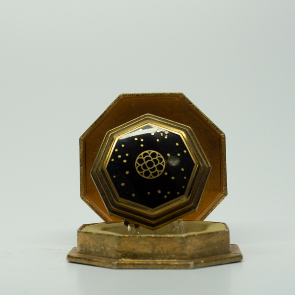 A gold octagonal box with a black stamp reading, "Le Debut Noir Richard Hudnut." Inside, is a brass compact with black enamel top. The compact opens on a hinge with a pop out mirror, two puffs, powder and a rouge.