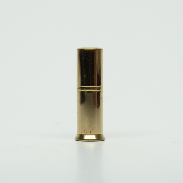 A brass lipstick tube with the Elizabeth Arden logo at its top. The tube can be opened by pulling the top from the base. A shade label on the bottom of the tube reads, "Elizabeth Arden / Red Feather / New York."
